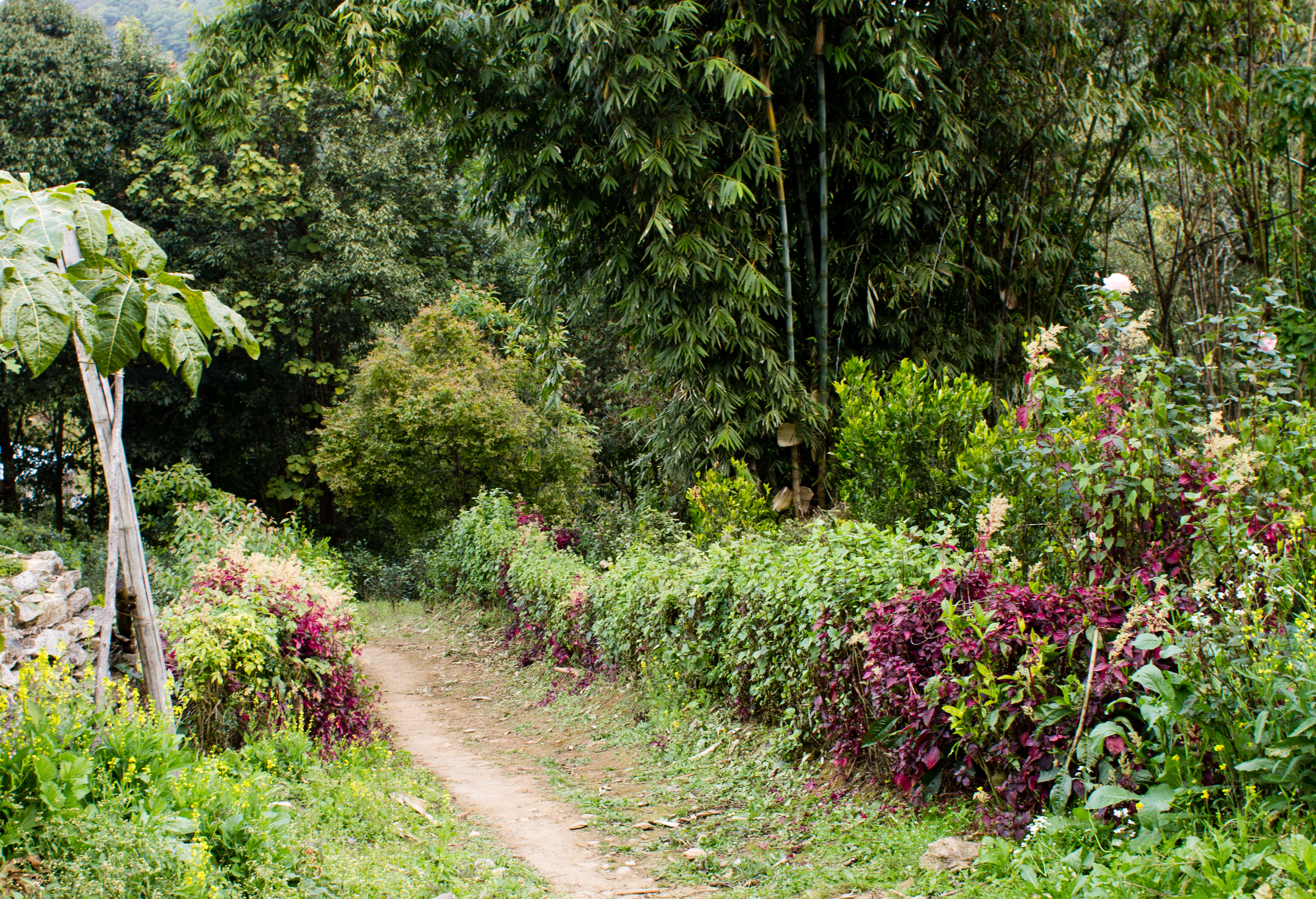 At 7:30 in the morning we unbundled ourselves from our blankets and made our way to breakfast. This time, the little cat sat in my lap. My stomach hurt so I ate lightly, again feeling remorse I couldn’t properly indulge in the nice cooking. And then we were off into the lingering dew, walking along a more meandering path that passed through more villages. Most of them are Danu villages, our guide told us. We peered around.