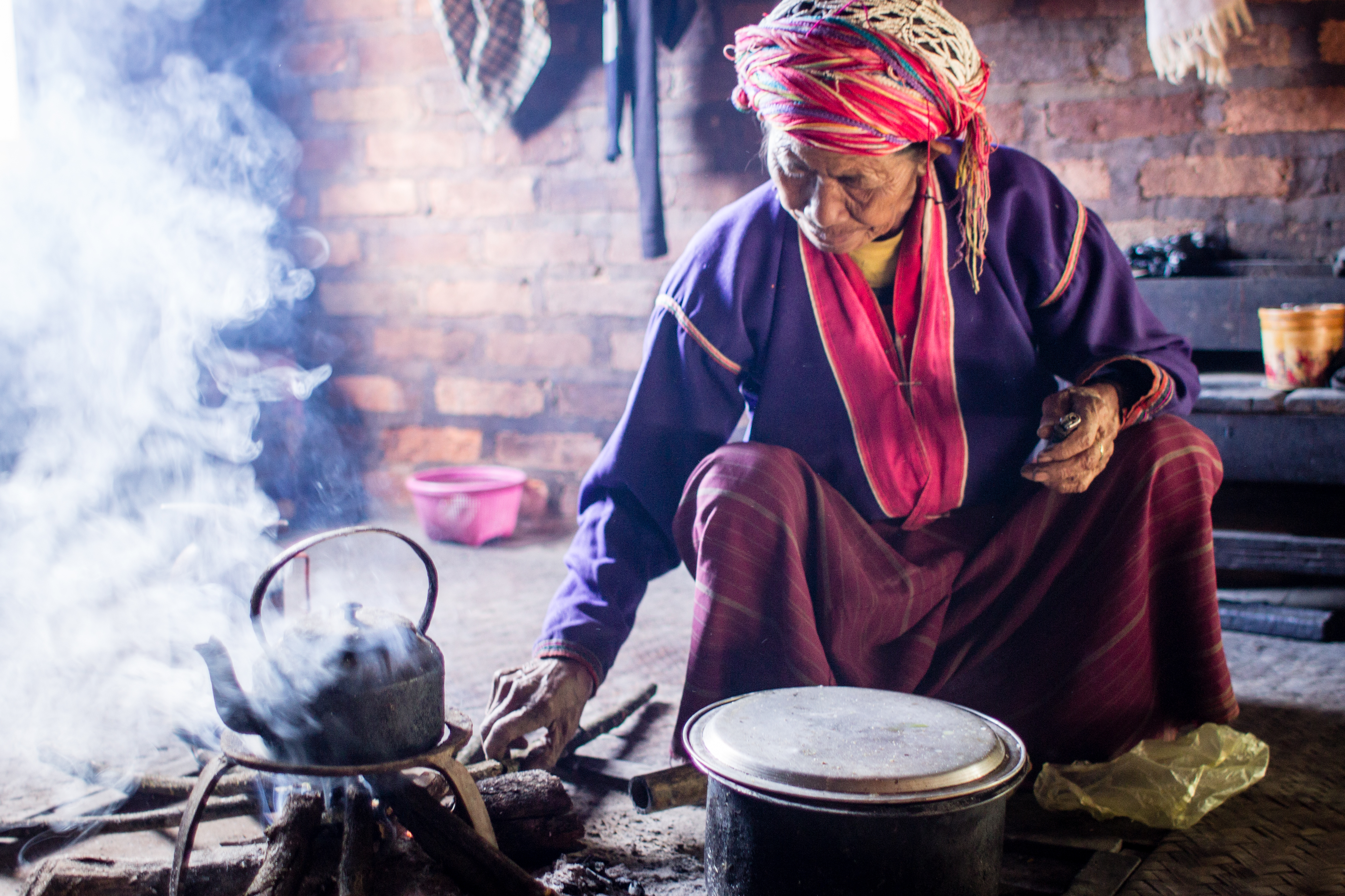 We were shown to a corner of a room in a monastery where we placed our packs by our bedding on the floor. Then, while our guides began cooking, we wandered around the grounds. An old lady came up to us where we had sat, motioning that we were sleeping in the monastery, and, pointing, she sleeps in her home right nearby. We smiled and nodded and she beckoned, come, come. So we followed. We knelt into her home and sat on her floor while she began making us tea. The boiling water spewed steam into the dark room, which swirled around us before escaping out the window. The woman brought a bag to us: dried tea leaves. For us? I gestured. Keep it, keep it. We sat and drank three cups of tea, just smiling back and forth. Then, a guide poked his head in, along with a German couple he was leading. They were staying one night at the old woman’s home before heading back to Pindaya. Please, tell her thank you from us, we asked. She’s deaf, the guide said. So we smiled and drank some more tea before gesturing we better get back to the monastery. We made our way back out into the dusky light, detouring around aggressive geese on the stairs.